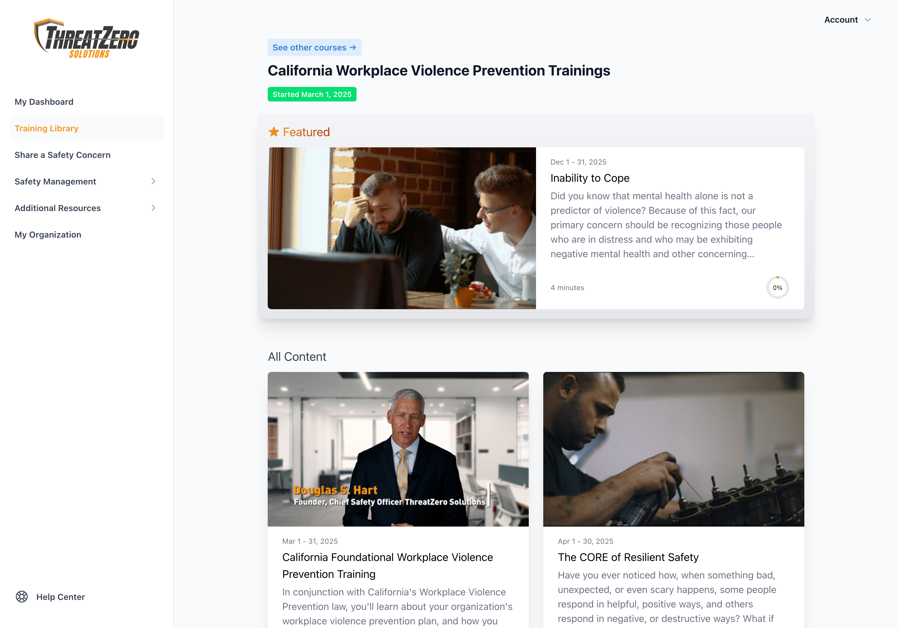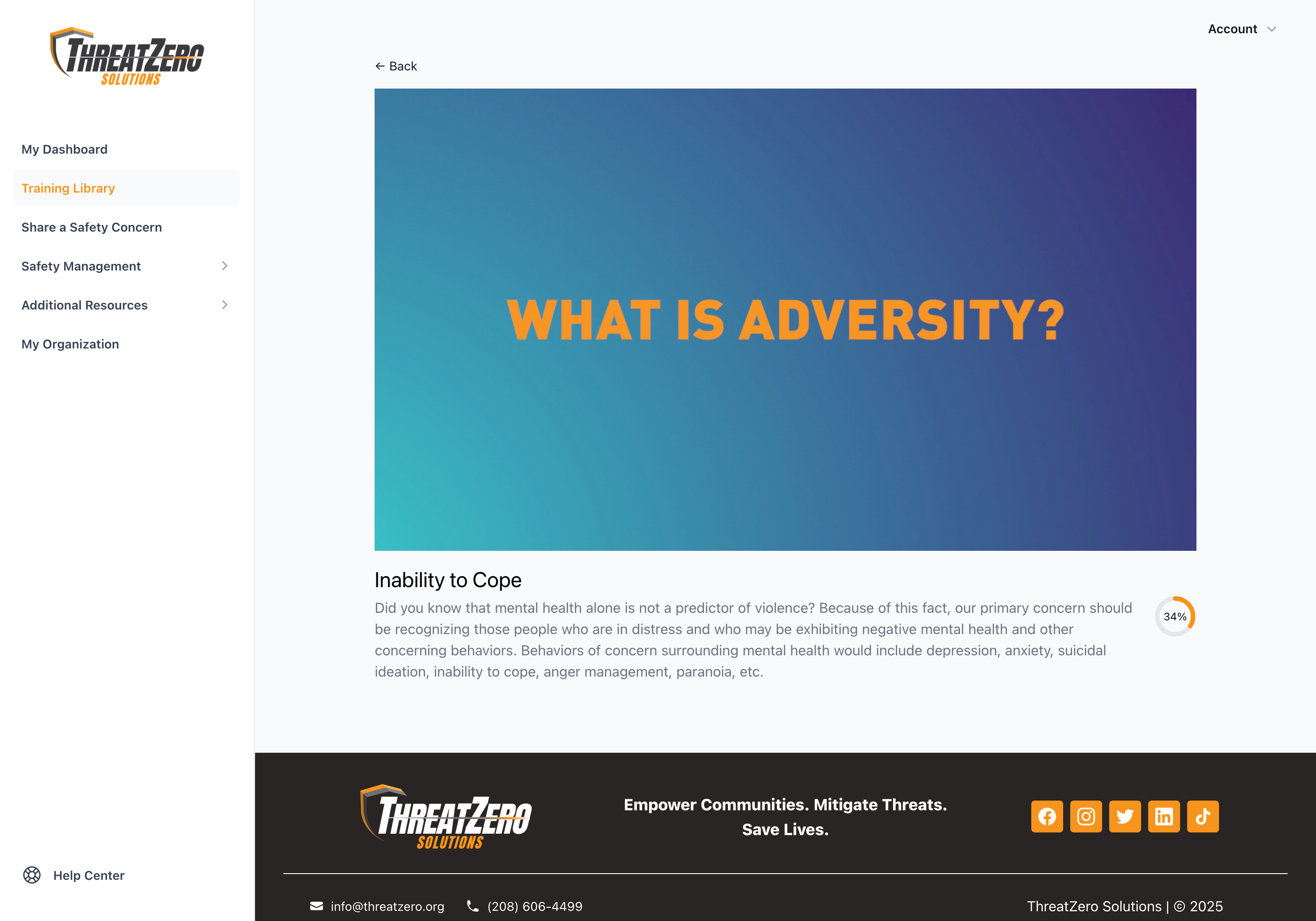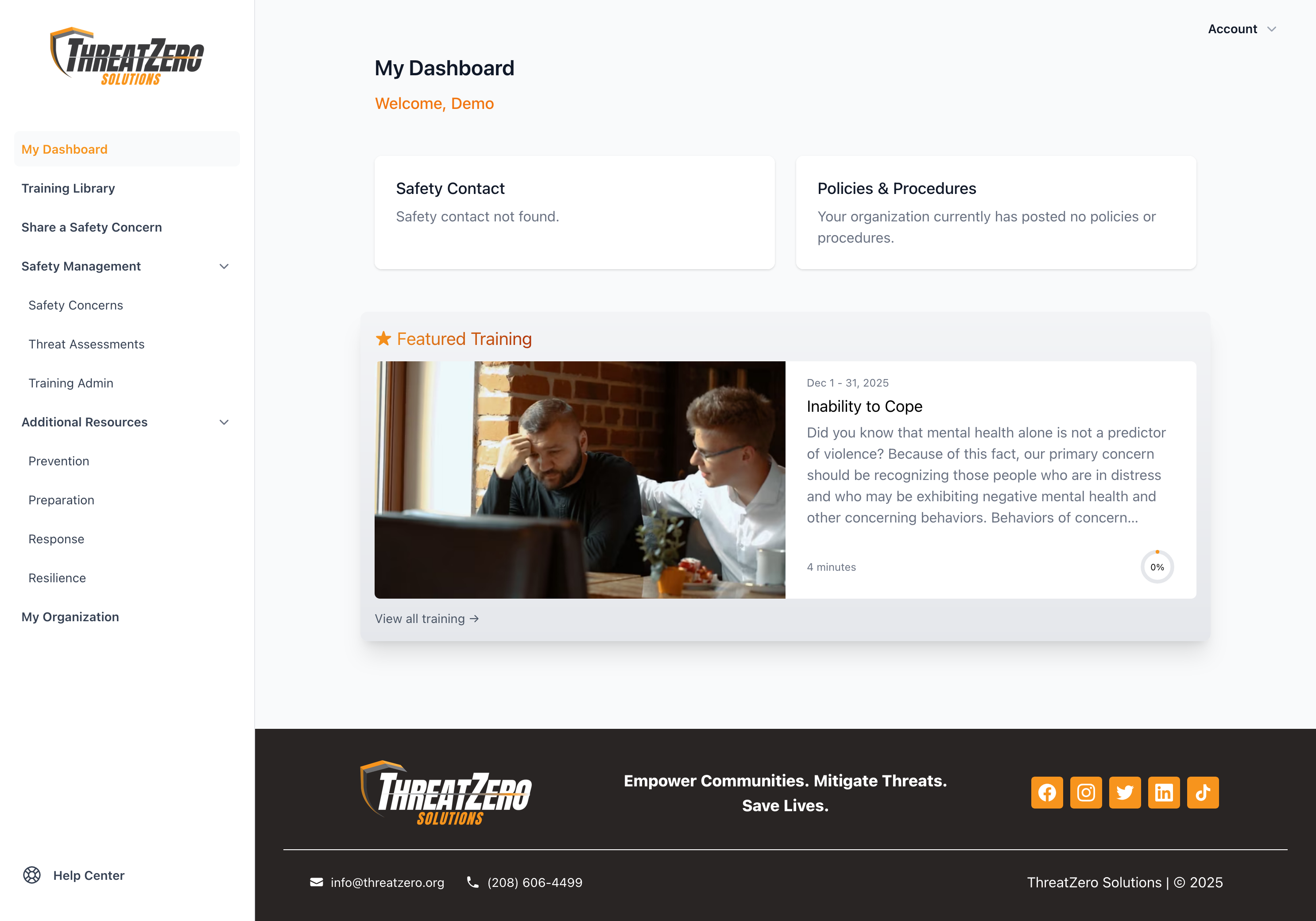 The ThreatZero platform is a web application that provides training and other tooling to schools and corporations to build a safe and resilient culture.