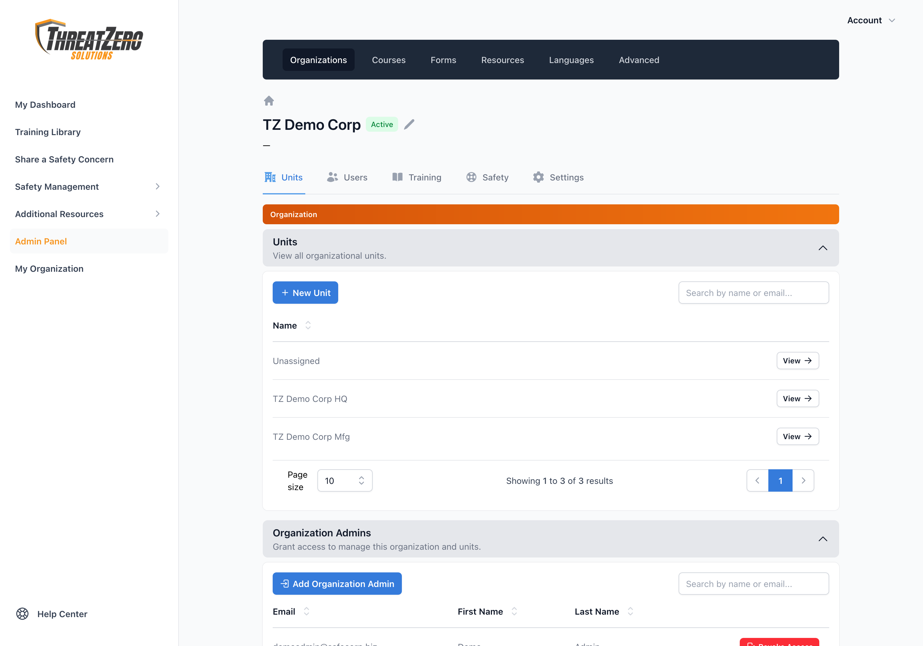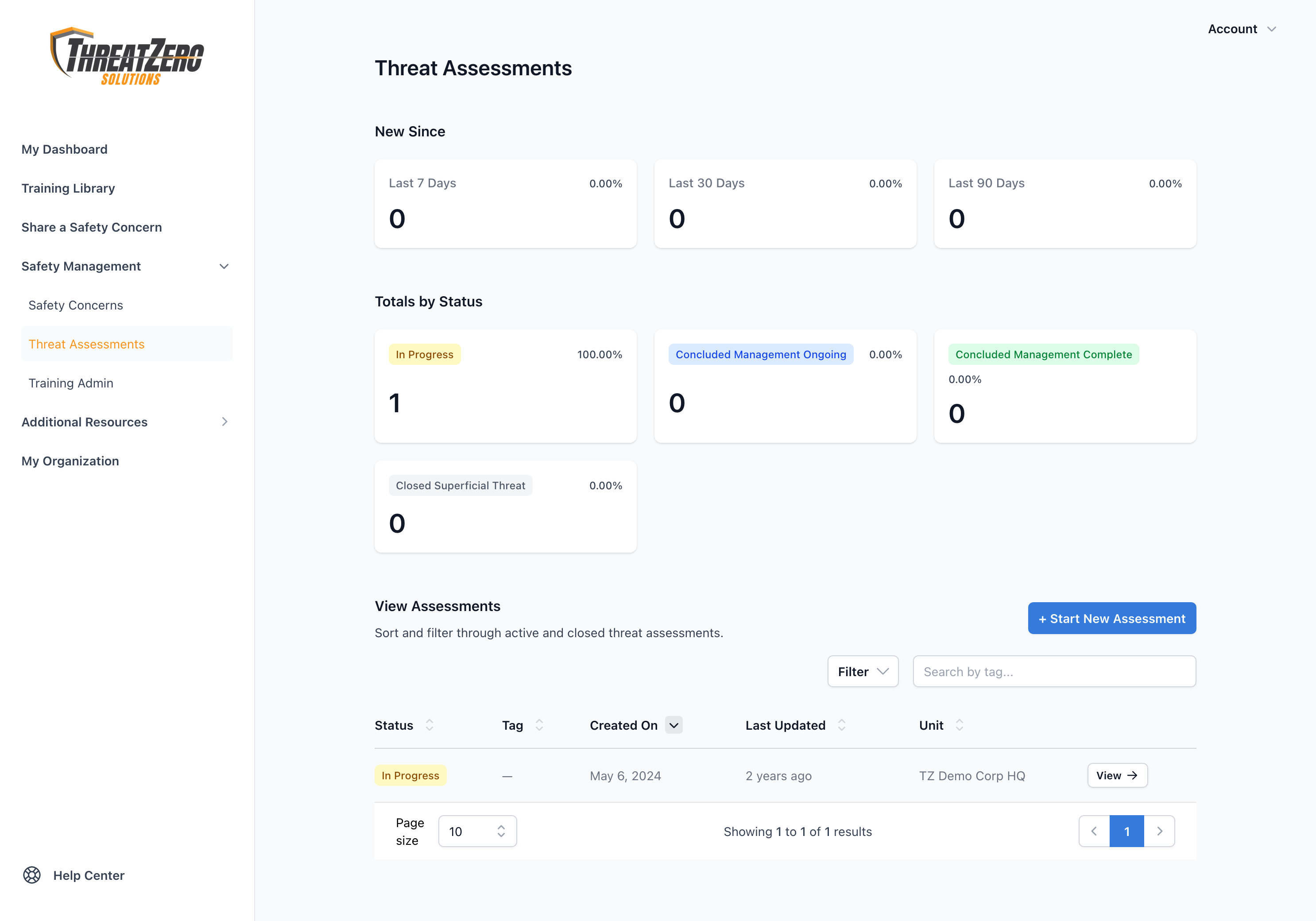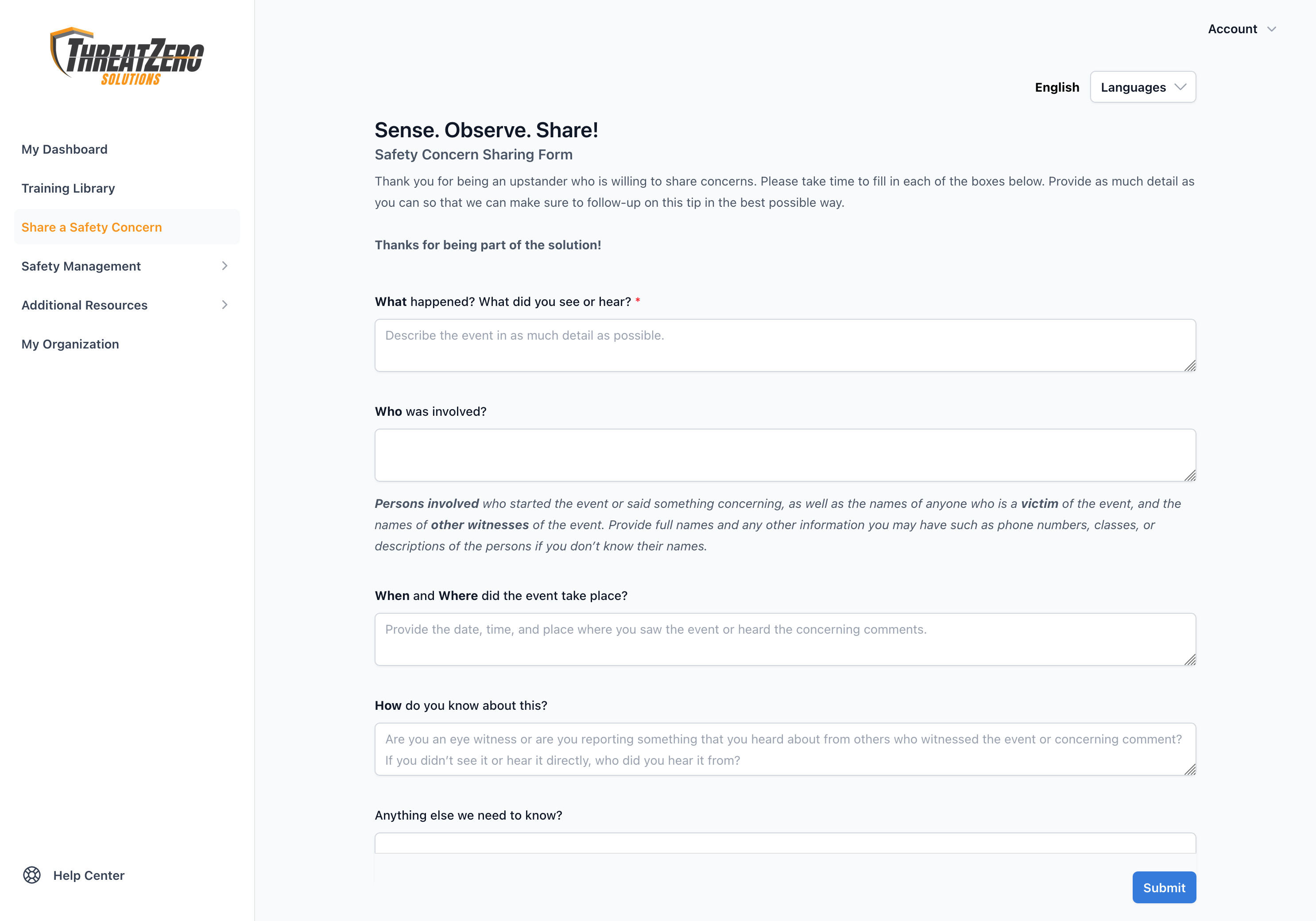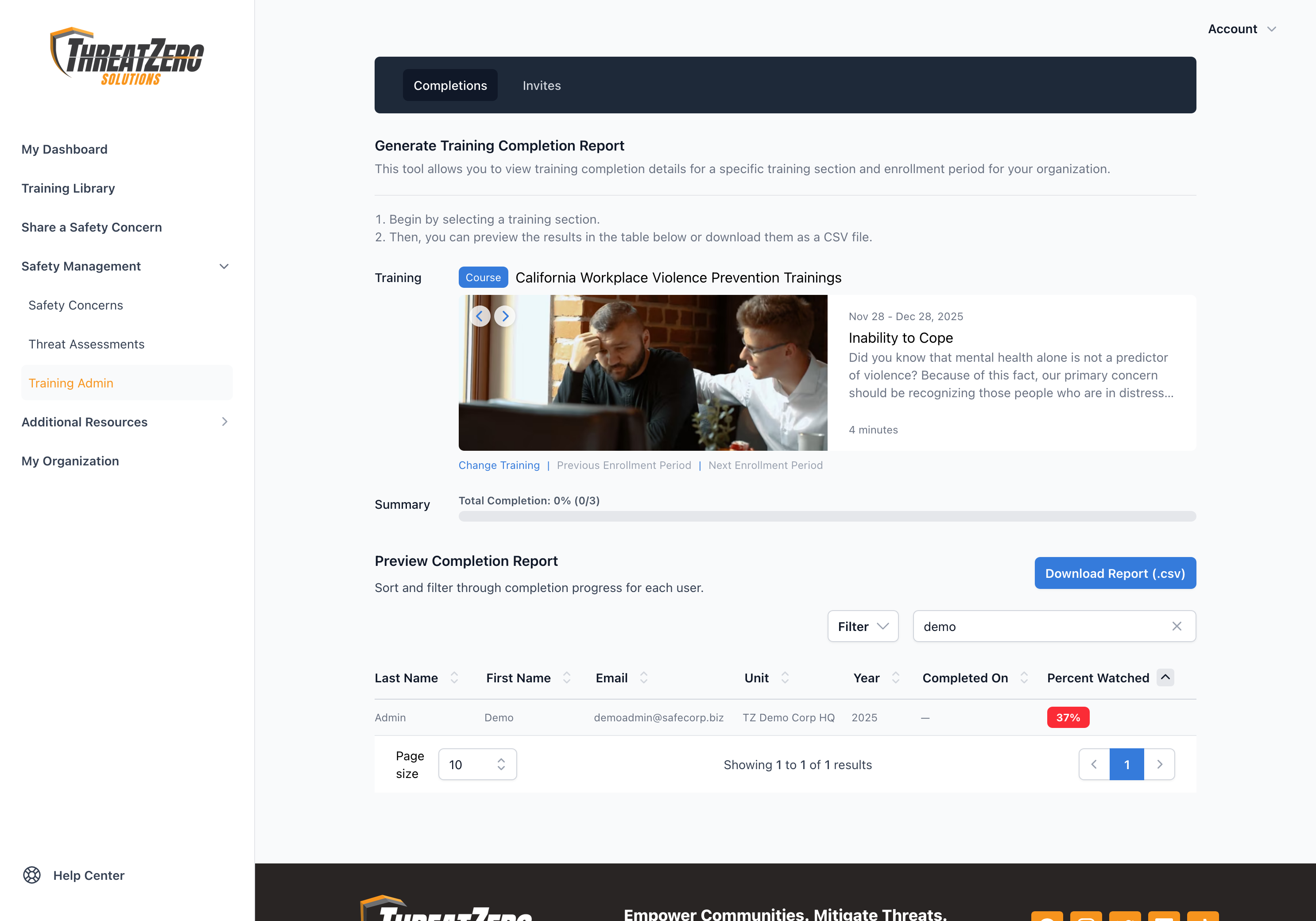 The ThreatZero platform is a web application that provides training and other tooling to schools and corporations to build a safe and resilient culture.